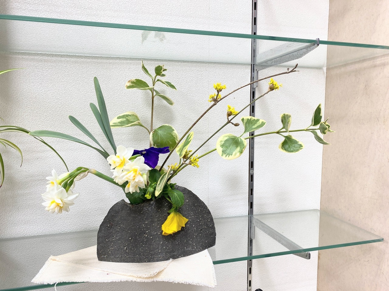 薬局に年末から飾っていただいてる松飾は、新たに蝋梅と水仙も加わりパワーアップしたお飾りになりました。