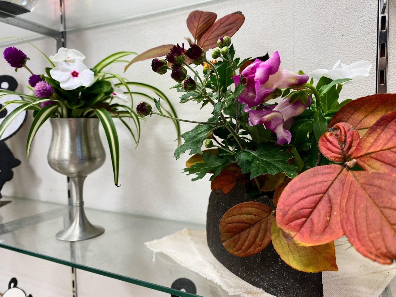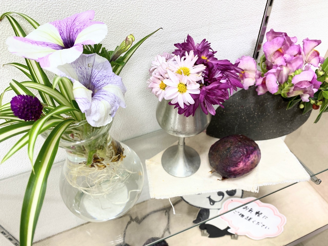 朝晩の冷え込みで、お庭に咲くお花の種類も減ってきているそうですが、それでも元気に咲いてくれてる子達を連れてきてもらいました。 薬局でも元気に咲いてもらってます