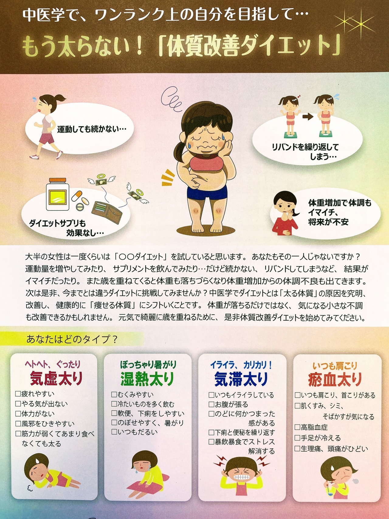 健康的に、リバウンドの無いダイエットを目指すのが、体質から変えていく中医ダイエットになります。