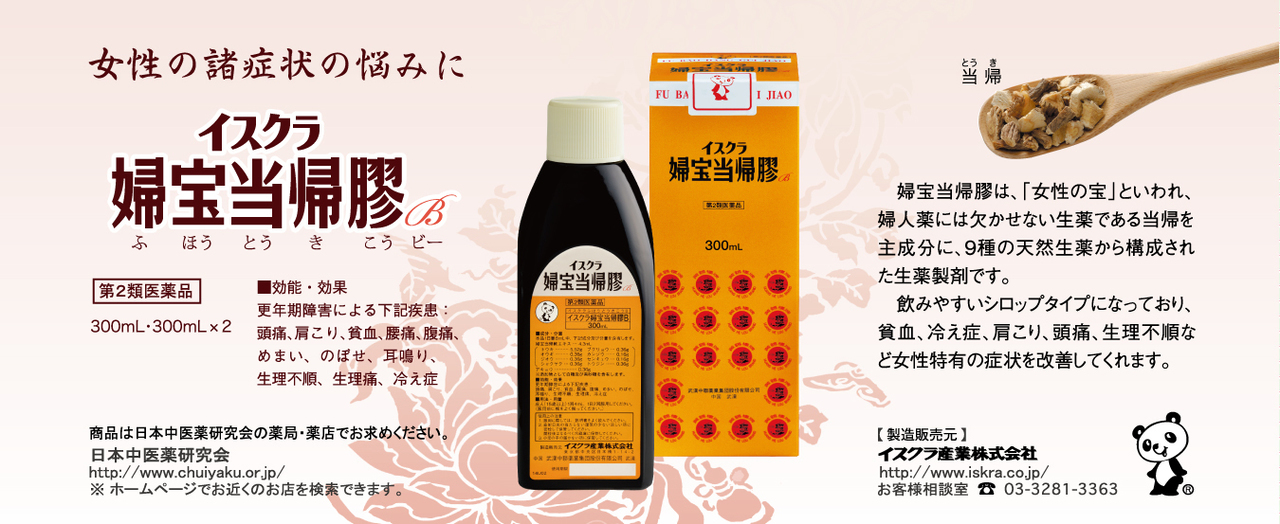 ご相談の上、症状に合えば月経の始まった15歳以上、阿膠(あきょう)という女性ホルモンに似た働きのある生薬が配合された婦宝当帰膠をホルモン補充として、お使いいただきたいです。